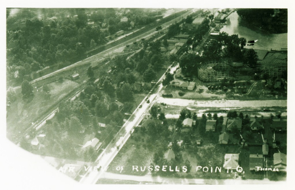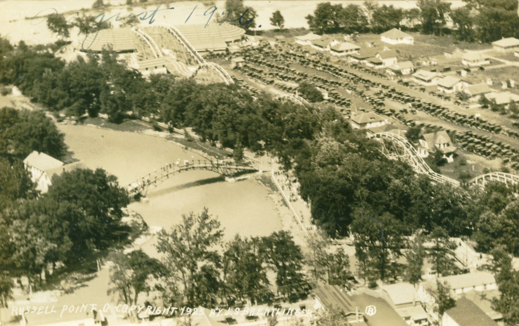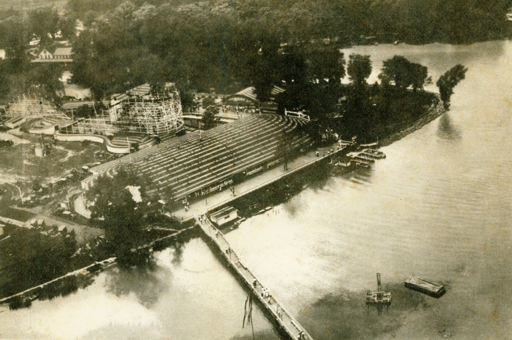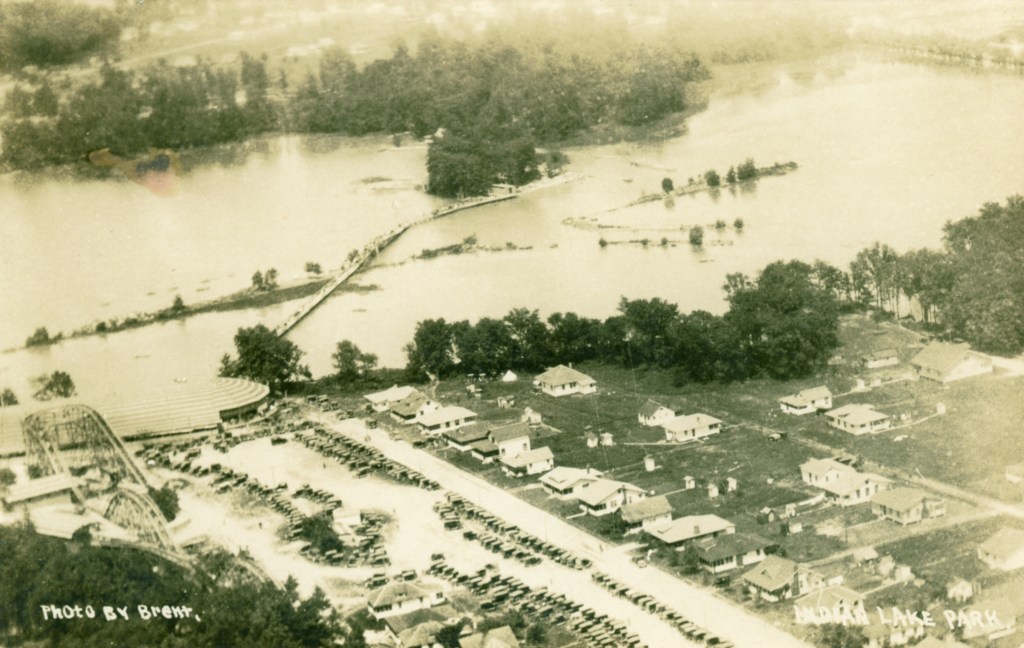 Aerial view of the amusement park on opening day, May 30, 1924. Near the top of the photograph the walkway or boardwalk to Sandy Beach Island is visible. In the center of the photograph is the Minnewawa Dancehall, which burned to the ground two weeks after Labor Day, 1935. The rollercoaster extended over almost a half-mile alongside the harbor. Notice the many cars parked along Chase Avenue.