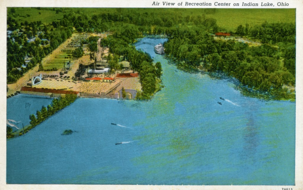 Looking north towards Orchard Island. The walkway connecting the amusement park with Sandy Beach Island is shown in the center of the postcard. Note how the walkway crossed over a small strip of land with some vegetation and trees. In later years, this strip of land constituted the northern boundary of the Spa, a state-of-the-art swimming pool.