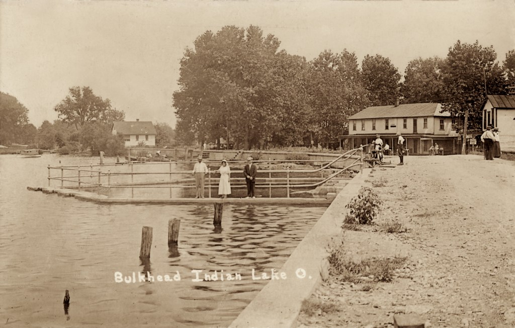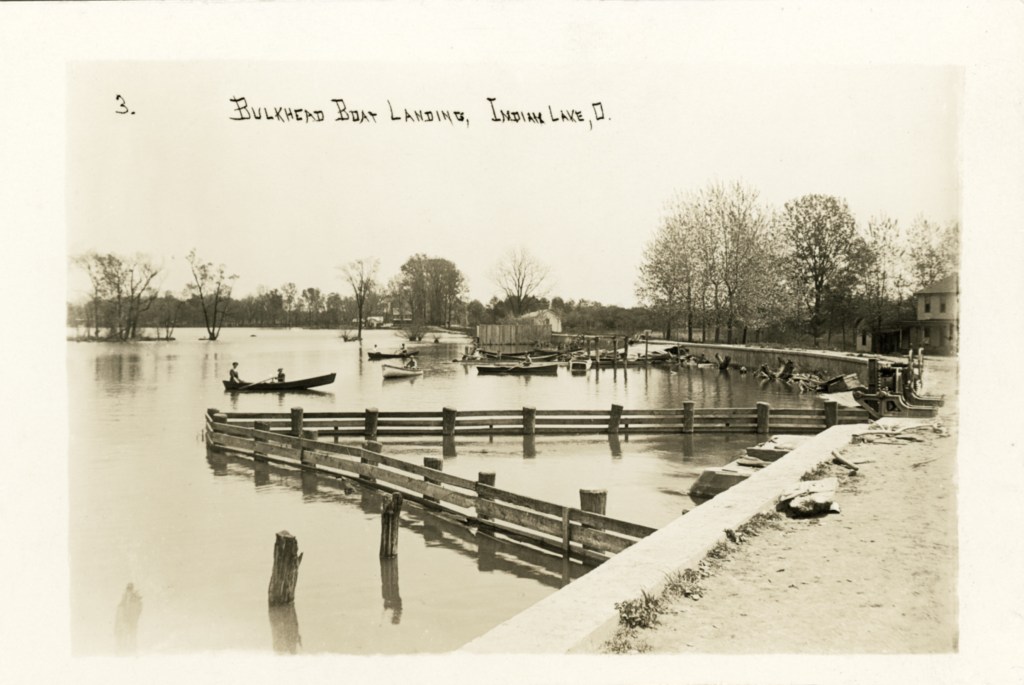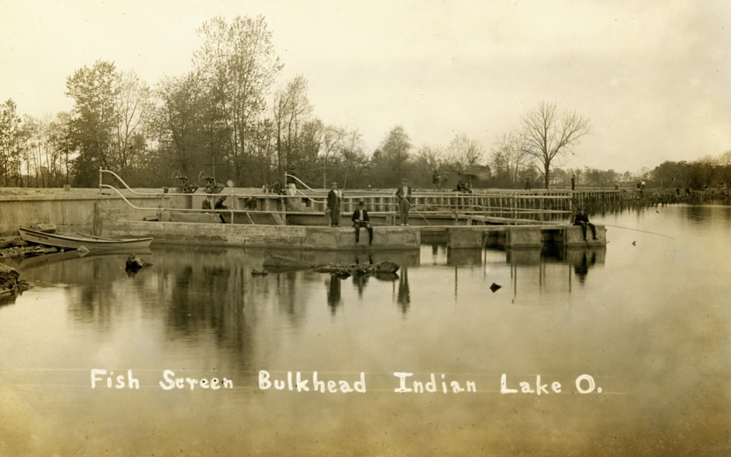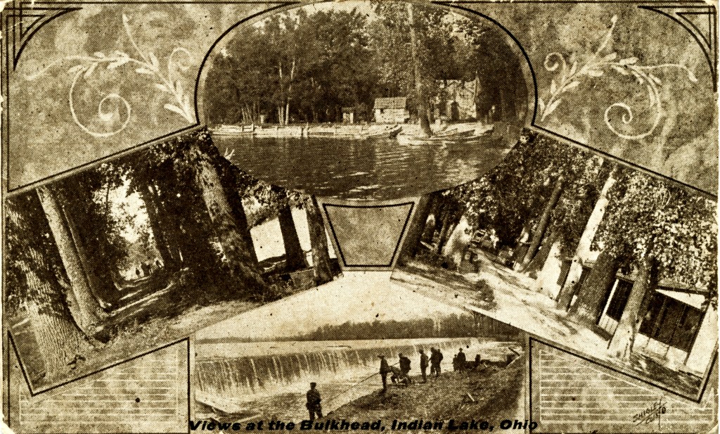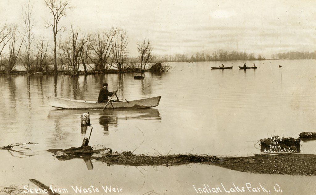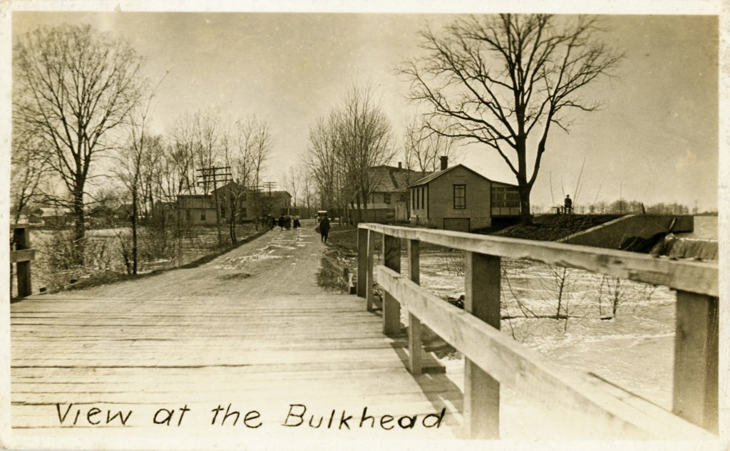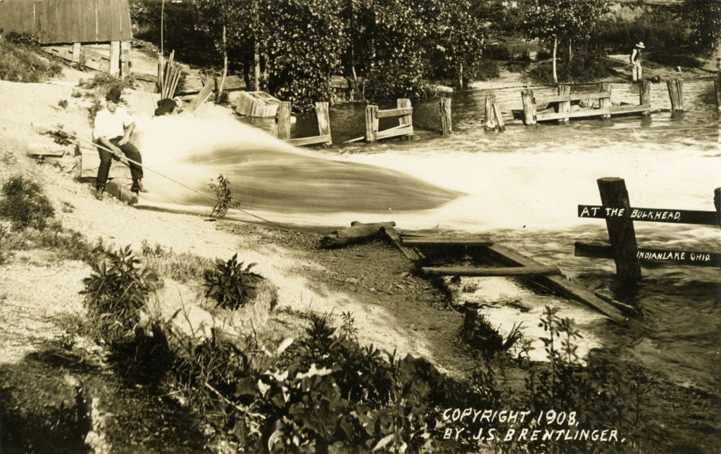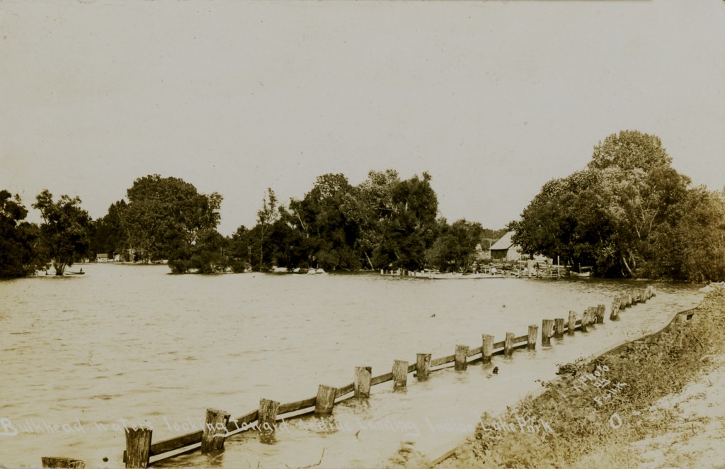 Looking east towards Andrus Landing before (left) and after (right) the shore was fortified with a cement wall. Note the triangular fish gate meant to prevent logs (and people?) from washing down the outlet. The contraption on the shore is for opening and closing the outflow; this is shown better in the postcard below.