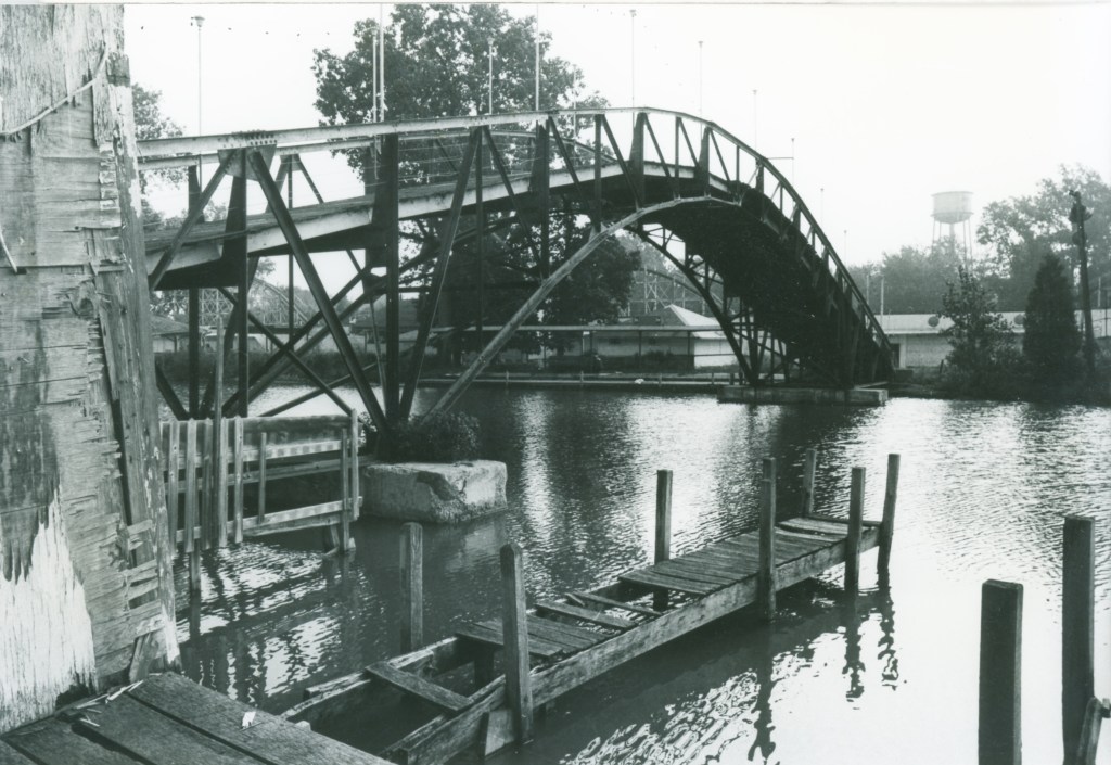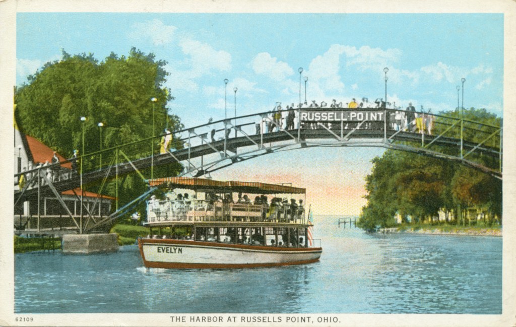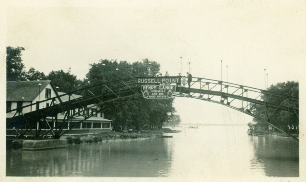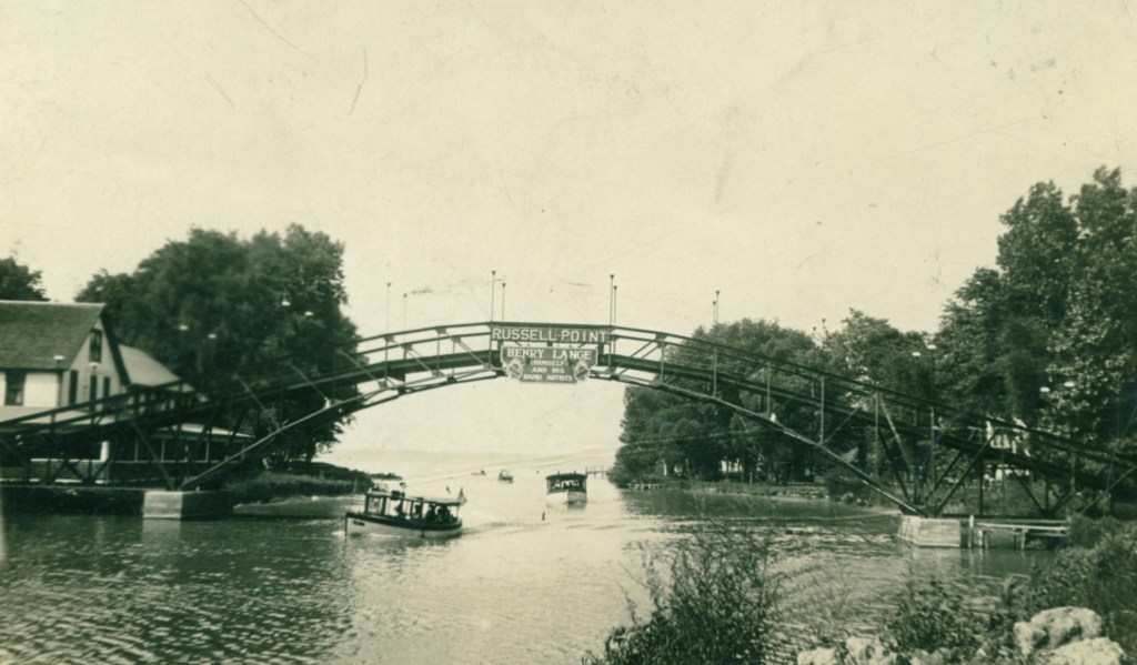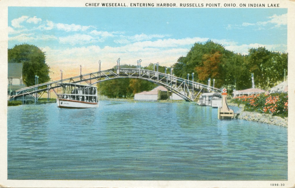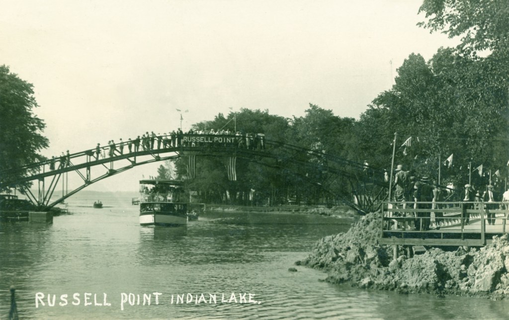The footbridge crossing the Russells Point Harbor was constructed in 1924 by Samuel “Pappy” and French Wilgus at a cost of $15,000. It connected the east side of the Sandy Beach Amusement Park to eateries and other attractions on the west side. The bridge closed along with the amusement park in the early 70s. A lack of continuing maintenance over the years led to the decking being removed in the mid 80s as a safety precaution. While new development began surrounding the bridge, the lighted steel structure became a widely recognized symbol for Indian Lake. Having grown up in the heyday of the Sandy Beach Amusement Park, the new developer, Mr. William “Bill” Reed, made sure the bridge remained. In 2009, after his death, the Reed family teamed up with the Indian Lake Area Historical Society to revive the bridge for enjoyment by the community and visitors. Fund raising began in earnest in 2010, with contributions from generous donors and active community support. Four years later, the largest crowd in the Russells Point area since the amusement park days witnessed the dedication of the refurbished Sandy Beach Bridge and William and Marjorie Reed Memorial Walkway, on August 23, 2014. The bridge, walkway, benches, and these historical markers are all part of the theme “Bridging the Past Into the Future”. We hope you enjoy your visit.