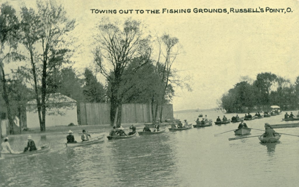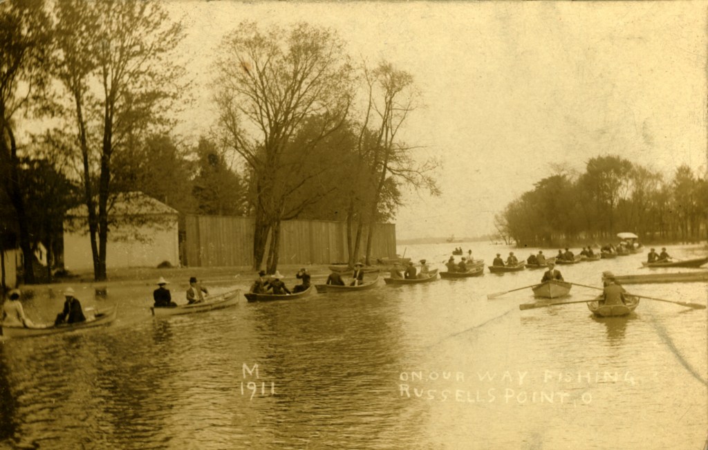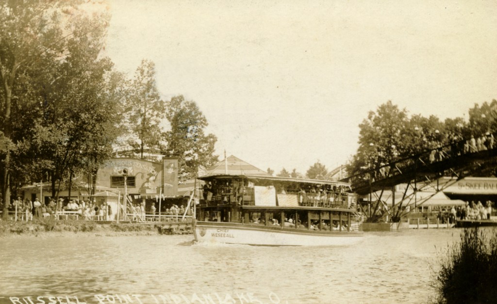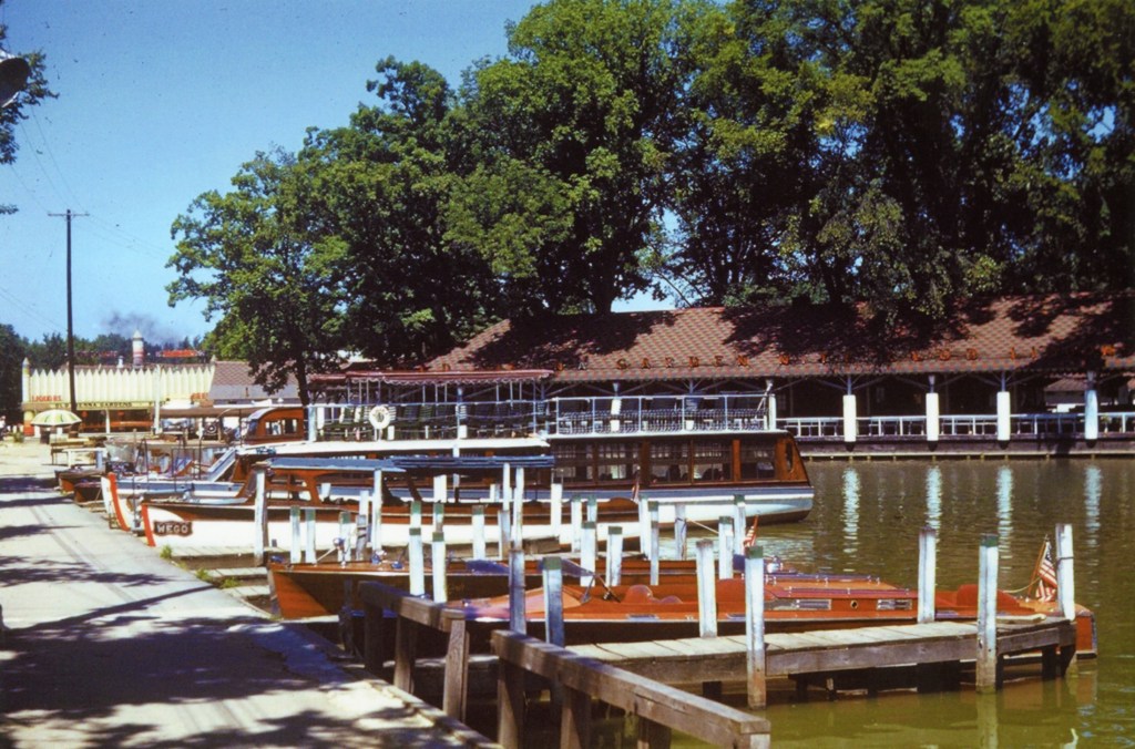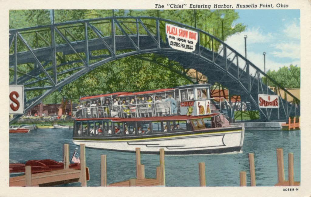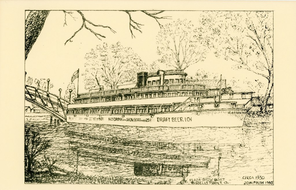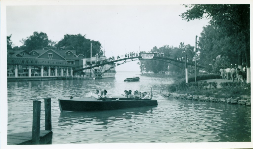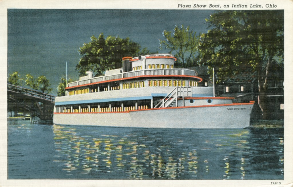 The Plaza Show Boat was designed by Nathan Coon for French Wilgus and opened in 1936. It was one hundred and four feet long and thirty feet wide, and could accommodate 600 guests. The main deck consisted of a large dining area with a large dancing area in the middle. More dining space could be found on the second deck, while the third deck accommodated office area and space for small private parties. Surrounding the main deck was an open-air promenade with chairs and tables for patrons to overlook the harbor. The boat’s appearance, complete with pilot house, masts, and smoke stacks, gave the impression of a tall yacht ready to sail to distant ports, but the Plaza Show Boat was actually permanently moored on the west side of the Russells Point Harbor, just north of the foot bridge.