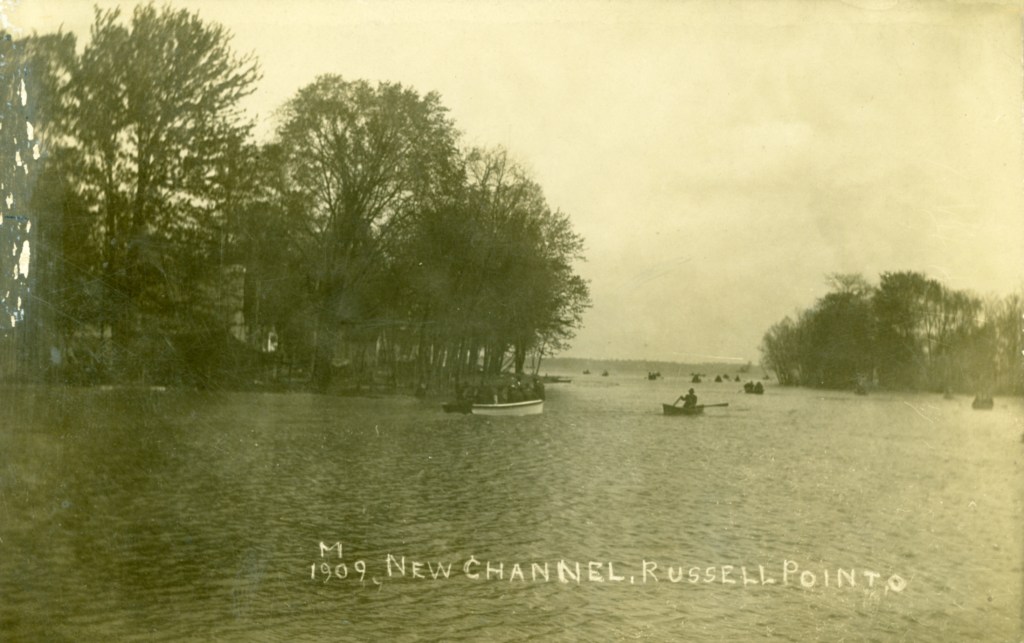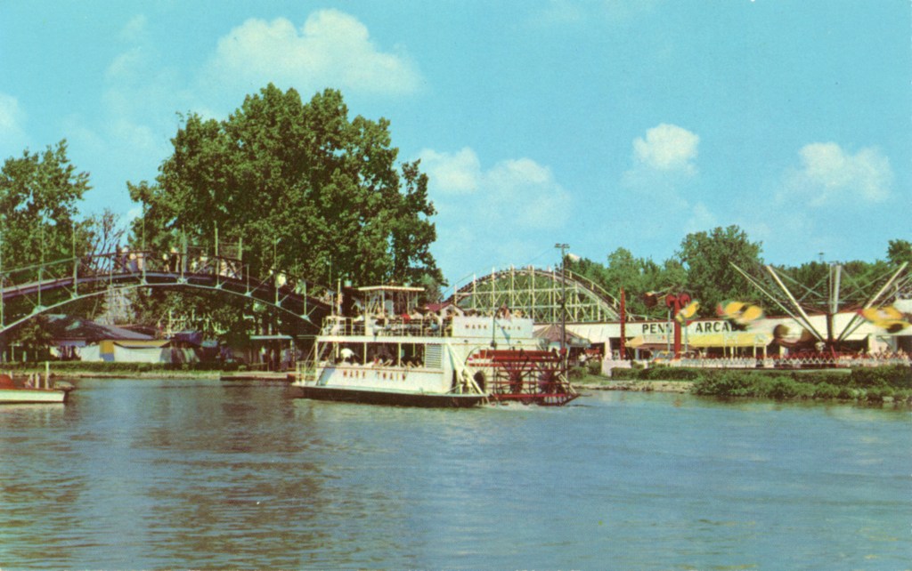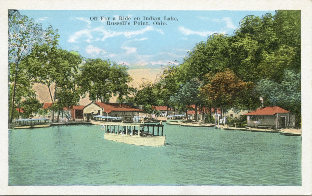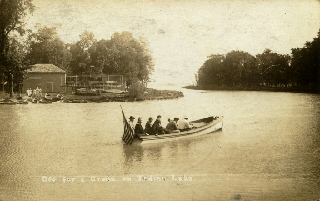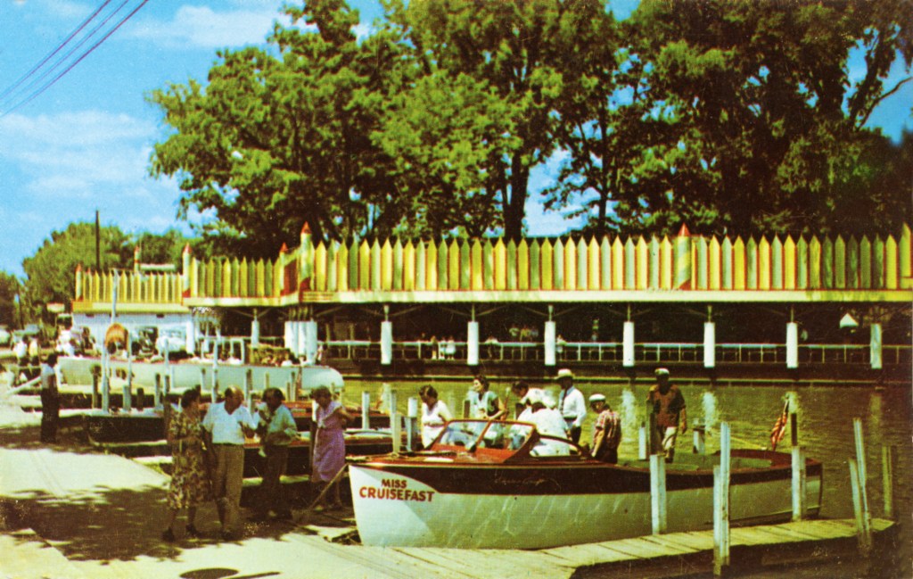After the Second World War more people began to acquire their own boats. The popularity of commercial boat rides declined and by the late 1960s such boats were nearly extinct. It was in these later years that the “Mark Twain” became the most popular tour boat on Indian Lake. Built in the style of a steam “paddle wheeler” by local resident Floyd Dever, this steel hauled, double-decked boat measured 18 feet wide by 60 feet long and could seat 175 passengers. This postcard is from the early 1960s and shows the sternwheeler Mark Twain approaching the steel bridge that spanned the harbor.