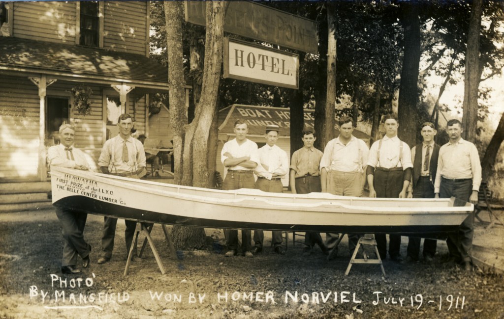 On July 19, 1911, Homer Norviel won the Hiawatha, the First Prize offered by the Indian Lake Yacht Club and presented by the Belle Center Lumber Co. Note the text on the roof of the smaller building in the background “Boat House – Bundy Landing.” This building can also be seen in the upper-left postcard taken a year earlier, without the text on its roof.