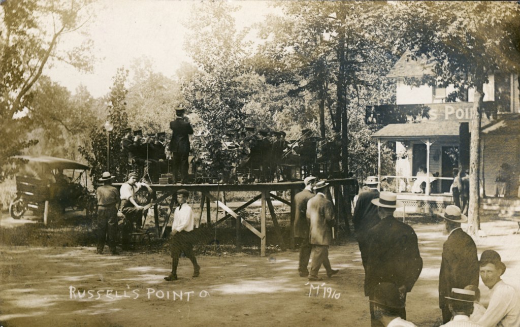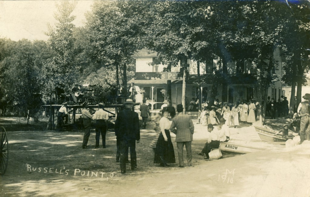 These postcards show people enjoying a band playing on a scaffolding erected in front of the Hotel Russells Point in 1910 – perhaps as part of the annual July 4th celebrations although the absence of American flags suggests this may have been another occasion for celebrating.