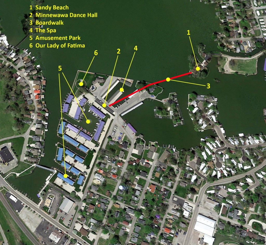 Sandy Beach Park opened on May 30, 1924. The summer before, Samuel “Pappy” Wilgus, and his son French Wilgus, had acquired the lease to the Cain property, and announced that they were going to build an amusement park. Five years earlier, Samuel Wilgus had established the Sandy Beach bathing area on a small island about 50 yards from the mainland, that was accessible by boat only. The first order of business was to build a one-mile long boardwalk, starting at Main Street and going all the way back to the lake edge; here, a walking bridge connected to Sandy Beach Island.