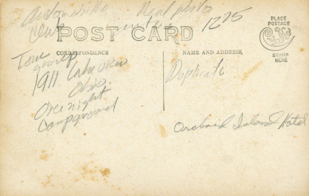 Front and back of a real photo postcard taken in 1911 showing a group of automobile enthusiasts spending the night on Orchard Island.