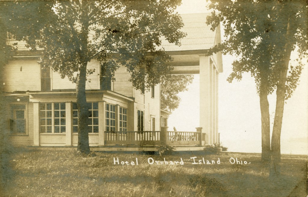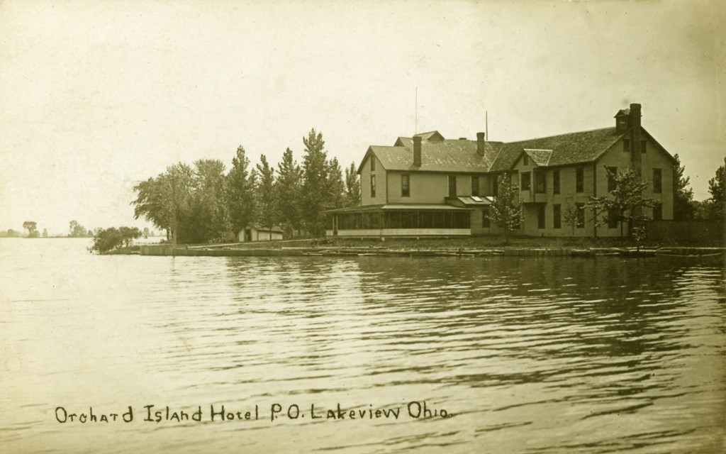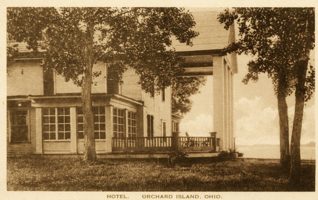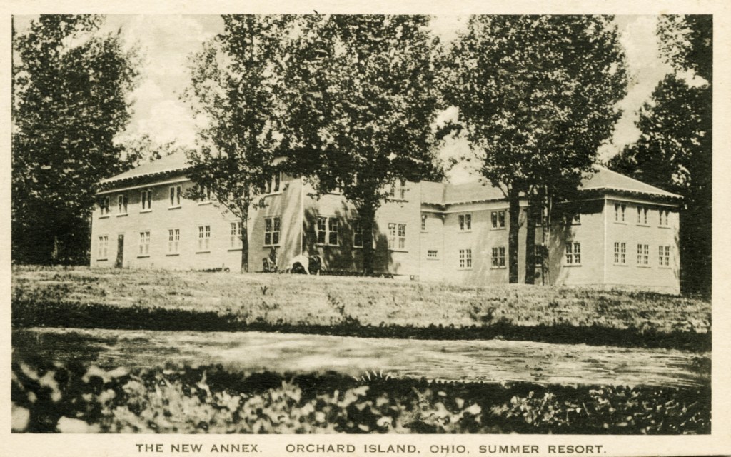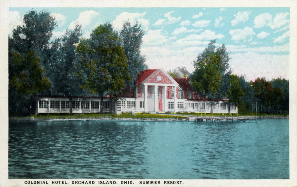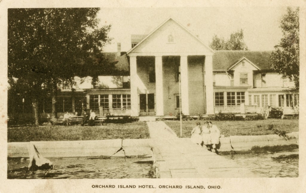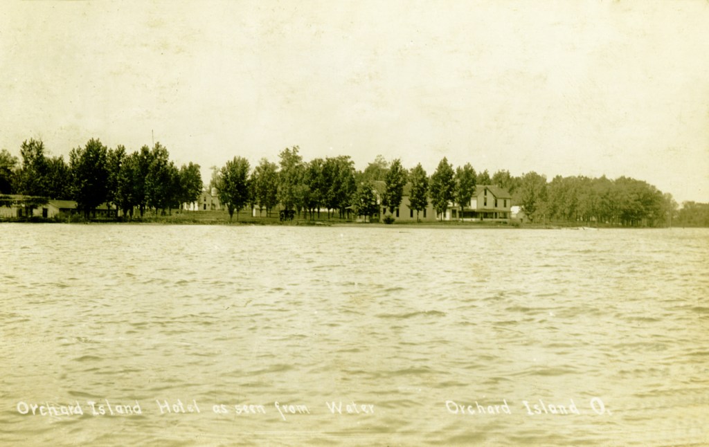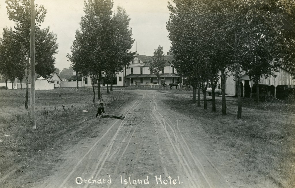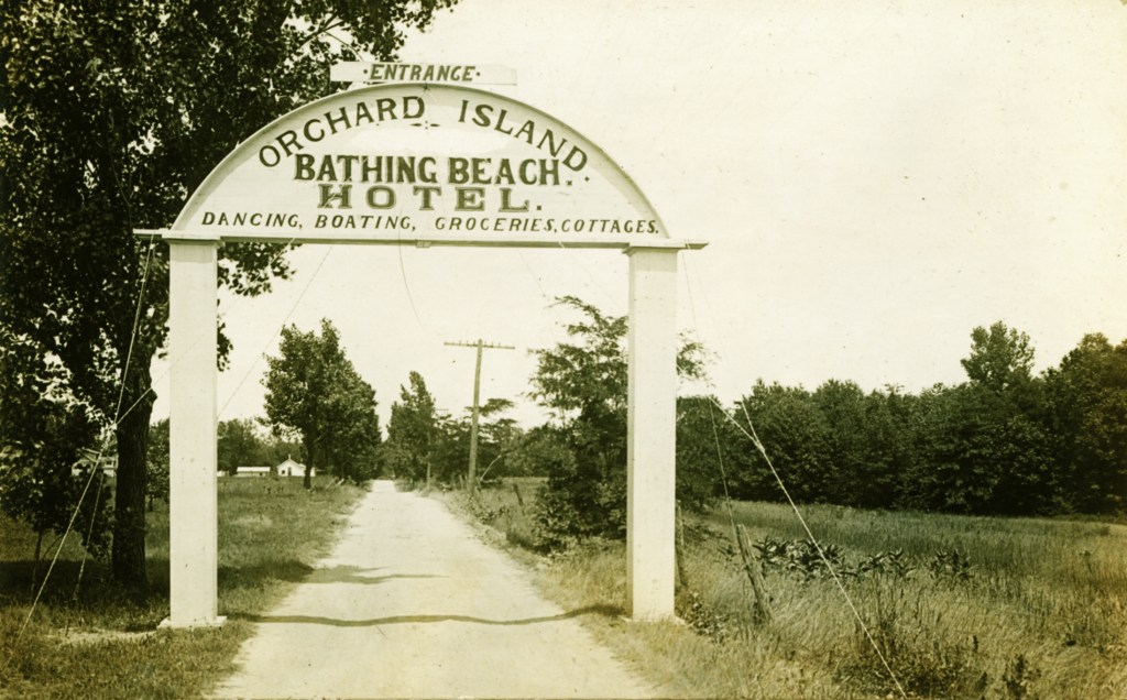 In 1900, Frank “Shad” Reed started construction of a “club house” on what was then still known as McClure’s Island. After purchasing most of the island in the following year, he replaced the club house with Reed’s Cottage, a two-and-a-half story first-class hotel. Four thousand North Carolina poplar trees were planted, and a road was built to connect Orchard Island with the mainland. The hotel grounds included stables for horses, and a boat landing with four expert guides who were in constant attendance to assist the hotel guests. Shad Reed did not get to enjoy his hotel for very long. By 1904, he had fallen on hard financial times and Harry Oldham was appointed assignee and took possession of the hotel and its grounds. The Probate Court decided to keep the hotel, then valued at $37,000, open as a resort because of the good patronage.