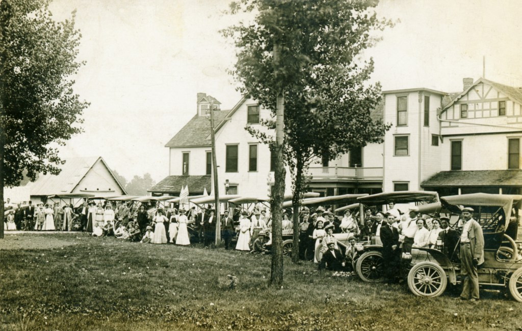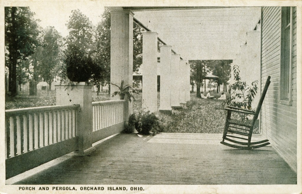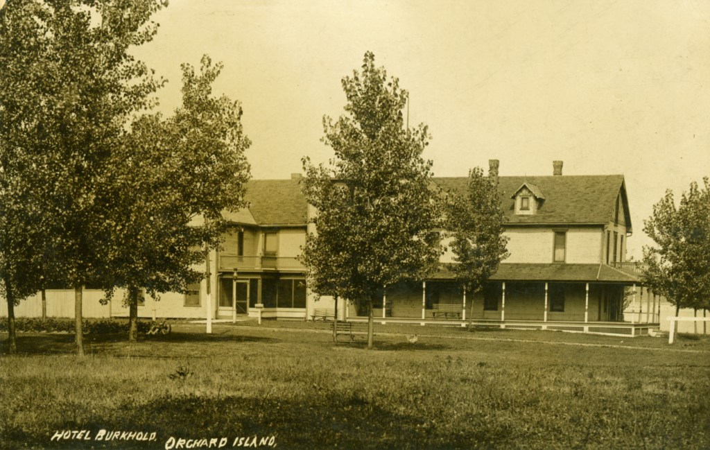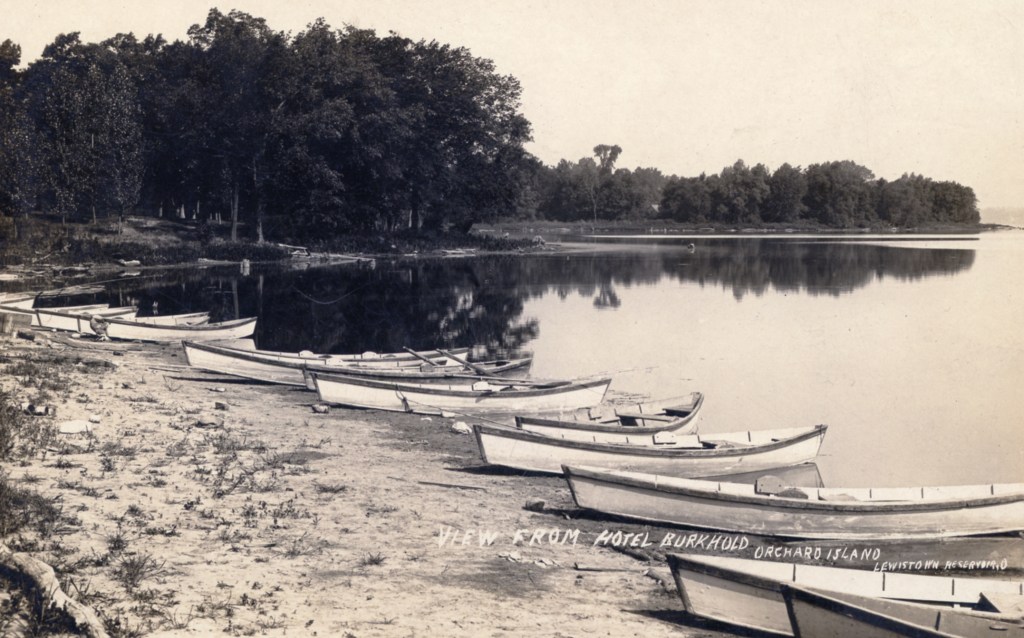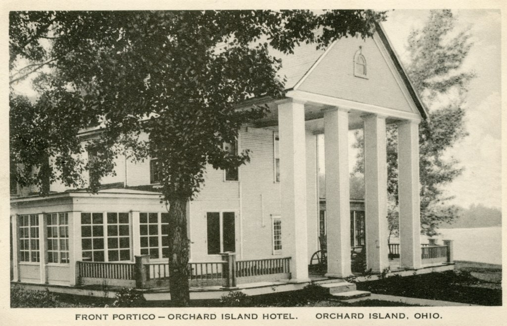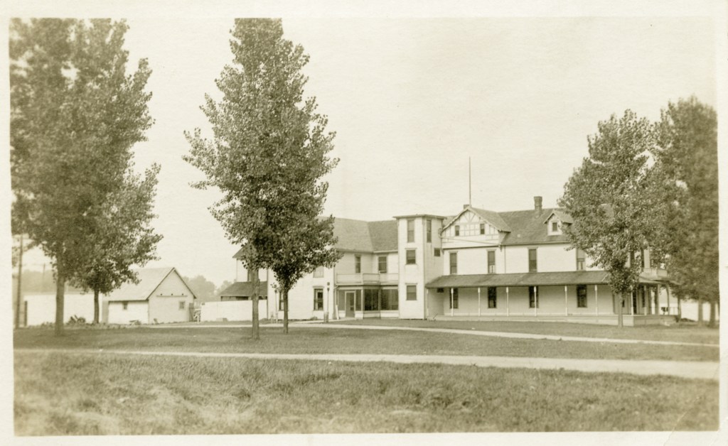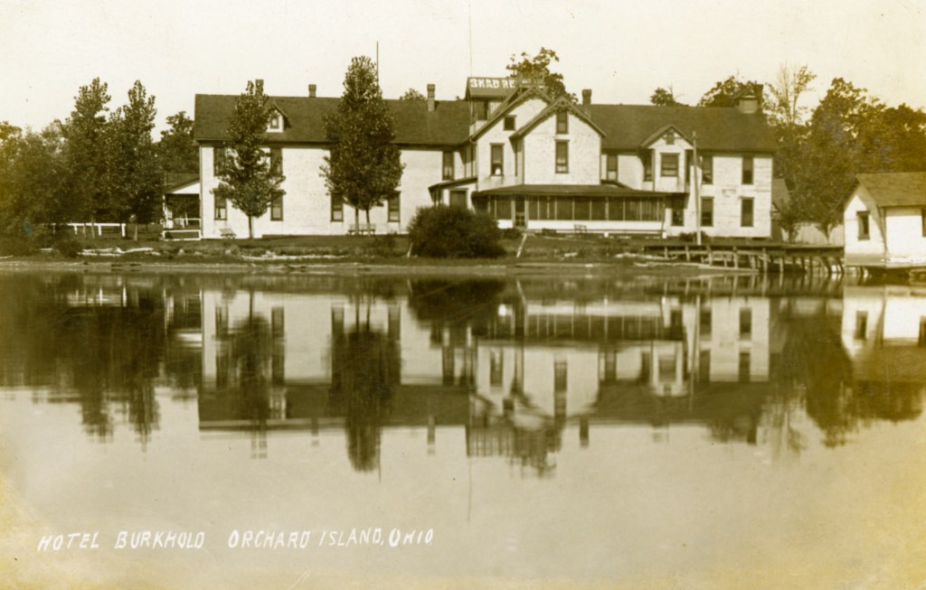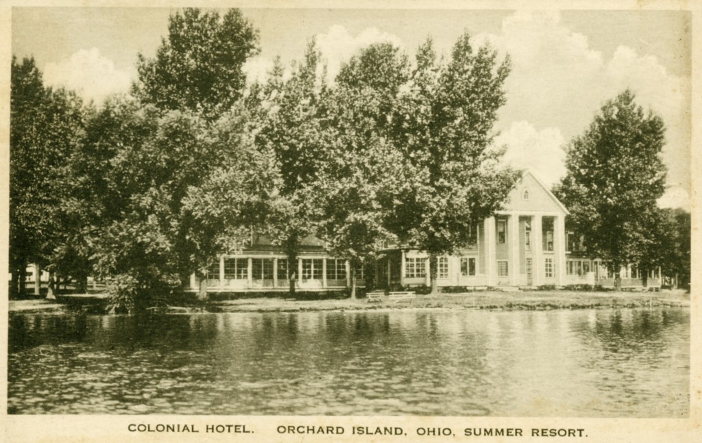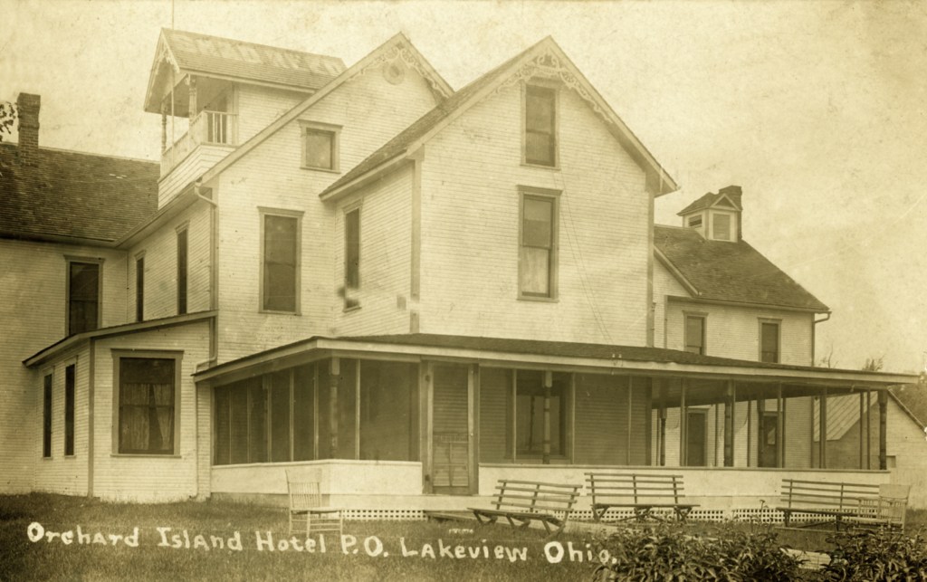 In 1900, Frank “Shad” Reed started construction of a “club house” on what was then still known as McClure’s Island. After purchasing most of the island in the following year, he replaced the club house with Reed’s Cottage, a two-and-a-half story first-class hotel. Four thousand North Carolina poplar trees were planted, and a road was built to connect Orchard Island with the mainland. The hotel grounds included stables for horses, and a boat landing with four expert guides who were in constant attendance to assist the hotel guests. Shad Reed did not get to enjoy his hotel for very long. By 1904, he had fallen on hard financial times and Harry Oldham was appointed assignee and took possession of the hotel and its grounds. The Probate Court decided to keep the hotel, then valued at $37,000, open as a resort because of the good patronage.