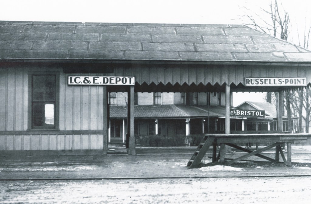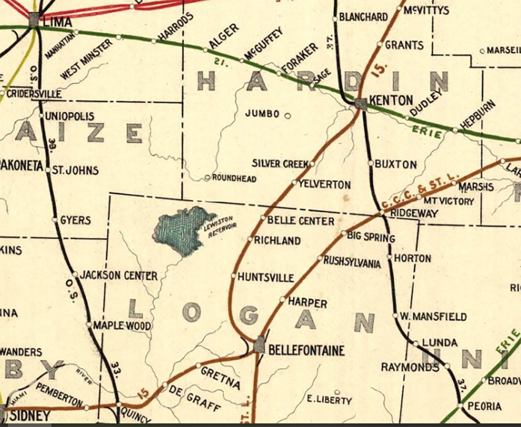 This detail of a map of railroad lines in Ohio from 1898 shows no lines servicing what was then known as the Lewistown Reservoir. To the west was the Ohio-Southern Railway through Jackson Center and Quincy, while to the east the Cleveland and Cincinatti Railway ran from Bellefontaine to Kenton, making stops in Huntsville, Richland (!) and Belle Center. A decade later Russells Point and Lakeview were serviced by two lines, the Toledo and Ohio Central Railway running from Bellefontaine to Wapakonetta, and an interurban line from the Ohio Electric Railway, connecting Bellefontaine with Lima.