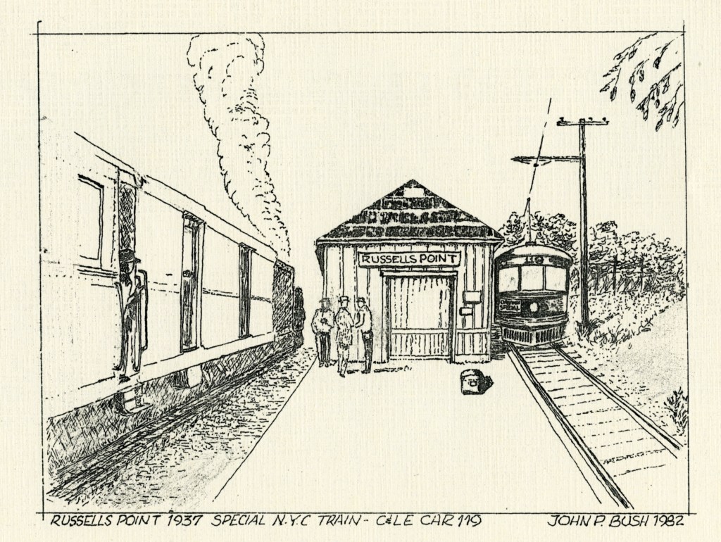 It looks like John Bush used this photograph as inspiration for his drawing, done in 1982. The person on the right has been replaced by an electric interurban rail car.