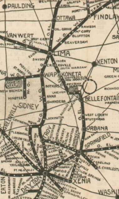 The map on the left shows a detail of a 1914 Railroad map with the T & OC line from Bellefontaine to Wapakonetta (yellow line) and the Ohio Electric Railway from Bellefontaine to Lima (dashed red line). The map on the right is a detail of the network of the Ohio Electric Railway.