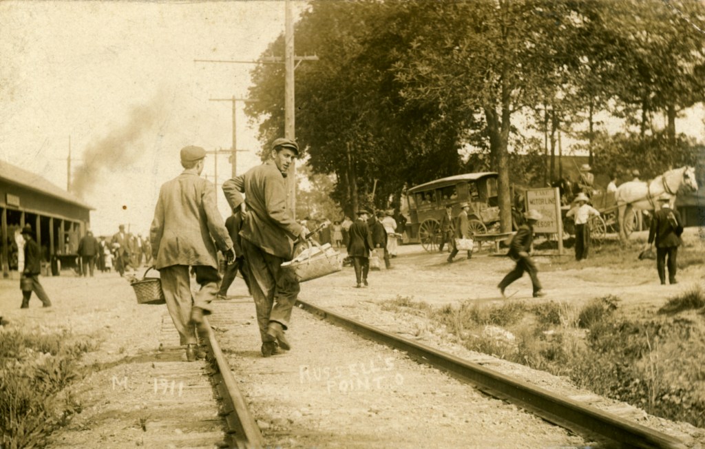 Passenger debarking the train and passing over the tracks on their way to the center of town. The sign across the tracks advertises rides to the main attractions. Note the electric poles along the tracks, providing electricity to the trains. Postcard dated 1911.