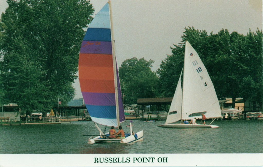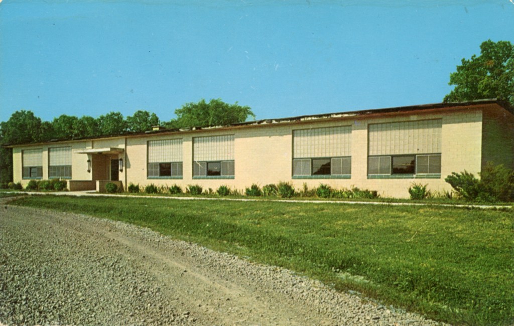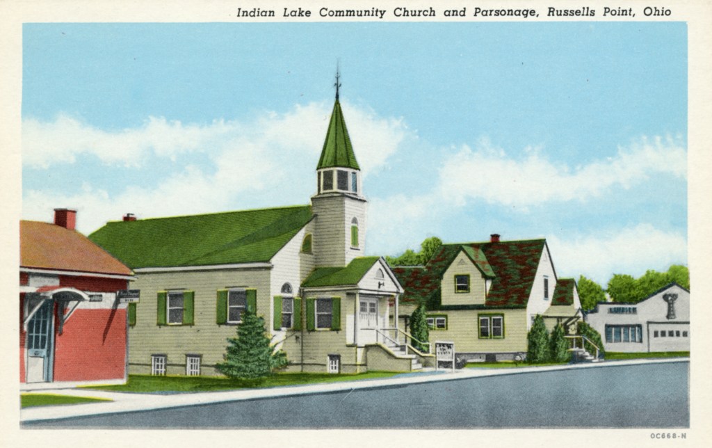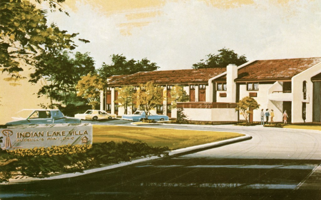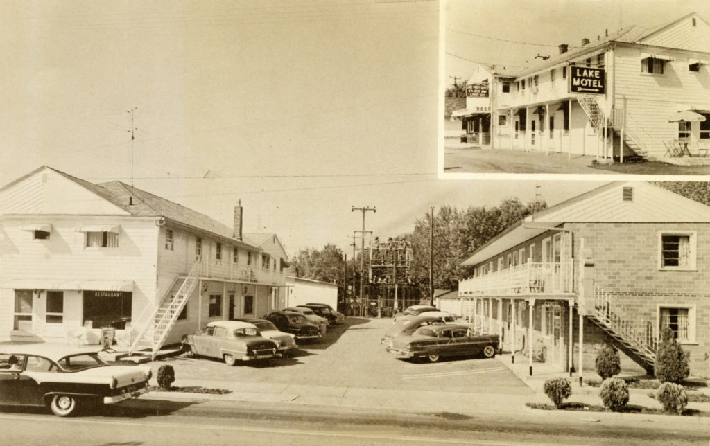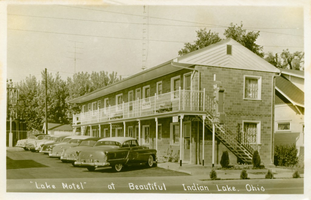 The Lake Motel was located at the southwest corner of Orchard Island Road and East Main Street. In 1921, Pat Sweeney built a hotel at that location, called the Acme Hotel. Later it was called the Ellmor and the Parker House. Around 1950, Joe Carter purchased the building and converted it into the Lake Motel, preferred by many people over the more fancier and larger hotels, just because it was small. The property was razed to make room for a branch office of the Bellefontaine Federal Savings & Loan. This bank was taken over by Sky Bank in the early 2000s, which was subsequently taken over by Huntington National Bank in 2007. Cars in the parking lot are the typical big automobiles of the late fifties and are evidence of the prosperous economic times.