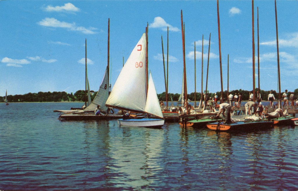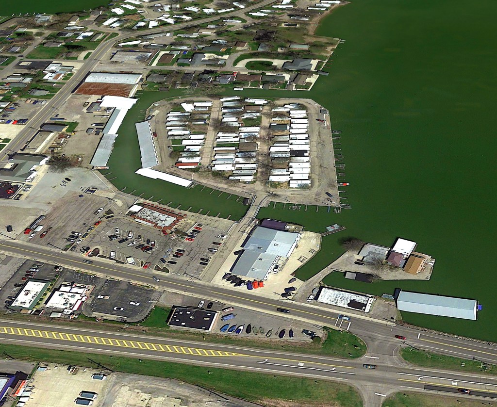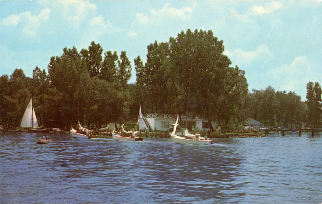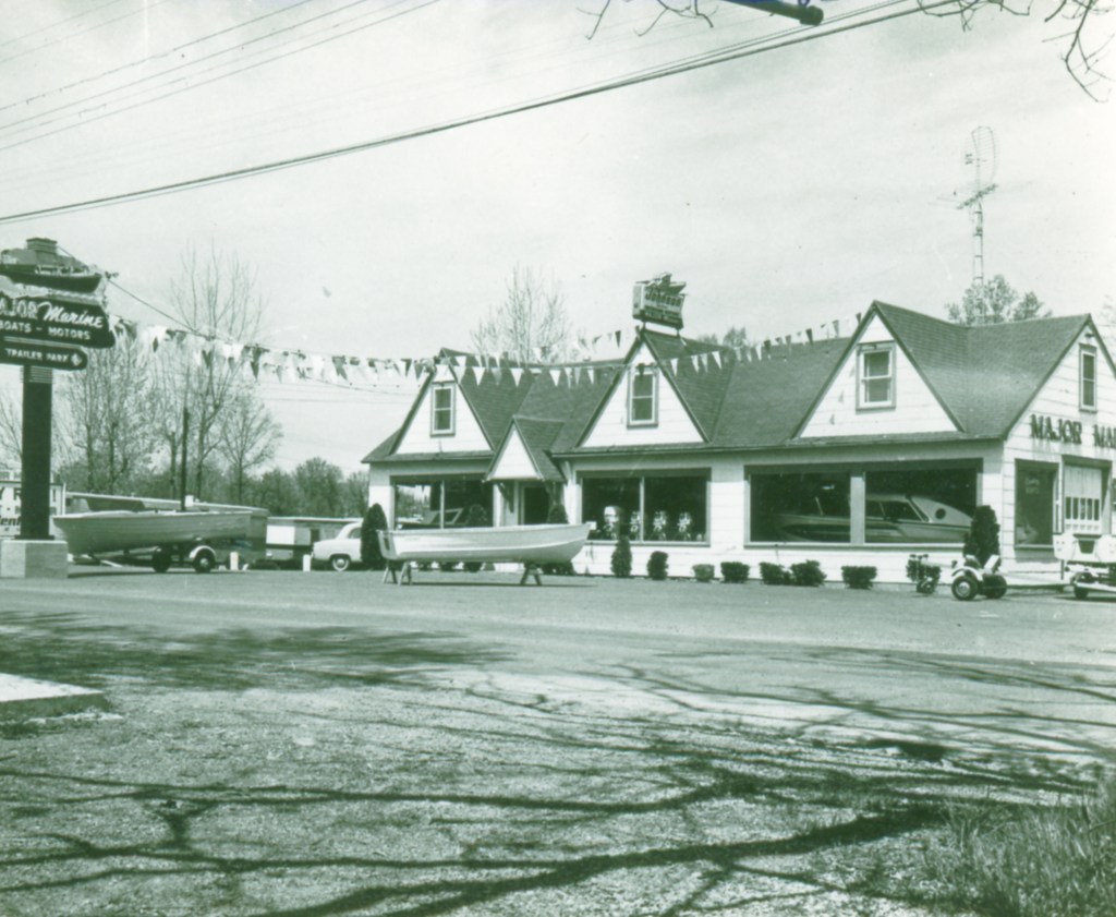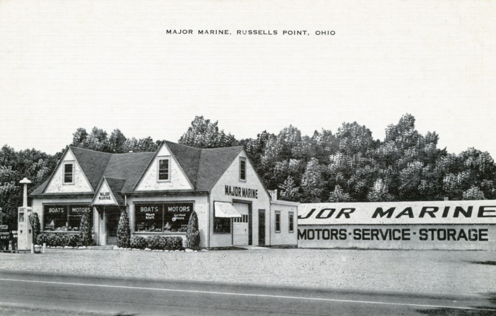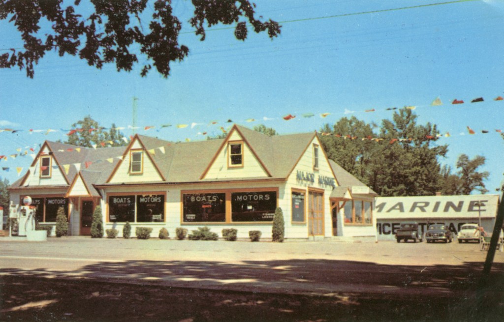Major Marine, established around 1930, offered complete marine services, including boats for sale or rent, a full line of marine hardware, paints and supplies, and dock and storage space. The gasoline pump in front of the building provided gas for highway travelers; a second gas pump was located at the docks for serving boaters.