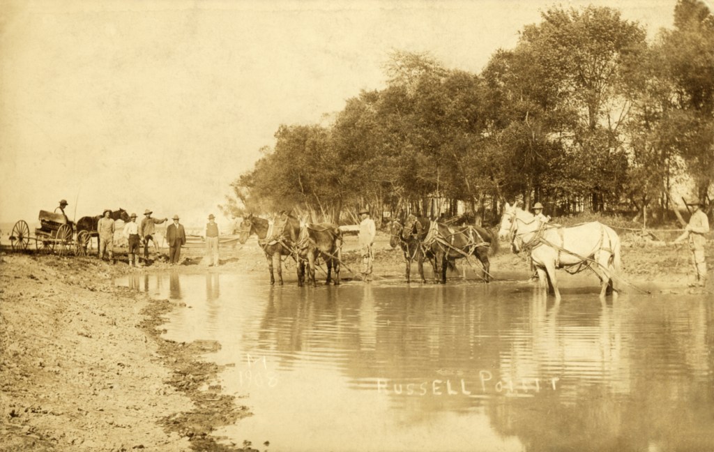 Two photo-postcards produced by Harry Mansfield in 1908. Mansfield signed his cards with the letter “M” and the year. It is unclear what the men shown in these postcards were doing.