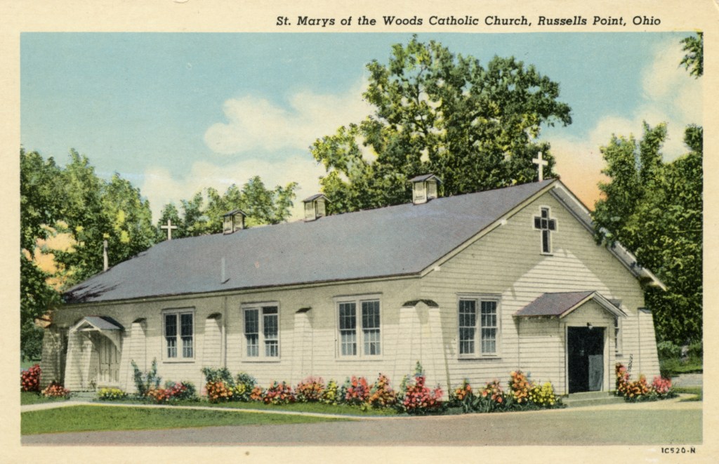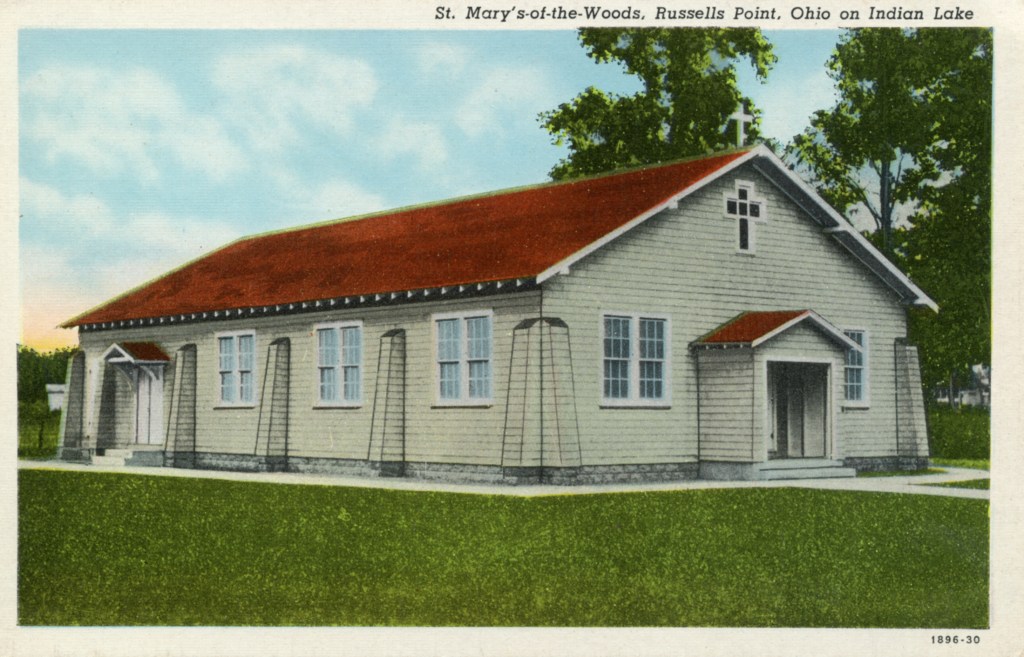 In 1921, the Catholic clergy in Bellefontaine started holding Sunday services in the coliseum on Orchard Island. By 1927 the original church building was constructed; Sunday Mass was celebrated during the summer months only. As the Catholic population grew, year-round services became a necessity. In August, 1956, the Tabernacle with its sacred contents was stolen from the church’s Sanctuary. It was never recovered. On February 11, 1961, just after renovations of the Sanctuary had been completed, the entire interior of the church was gutted as a result of arson. Religious services were continued at the dance hall of the amusement park. On July 29, 1962, the new and expanded building was dedicated.