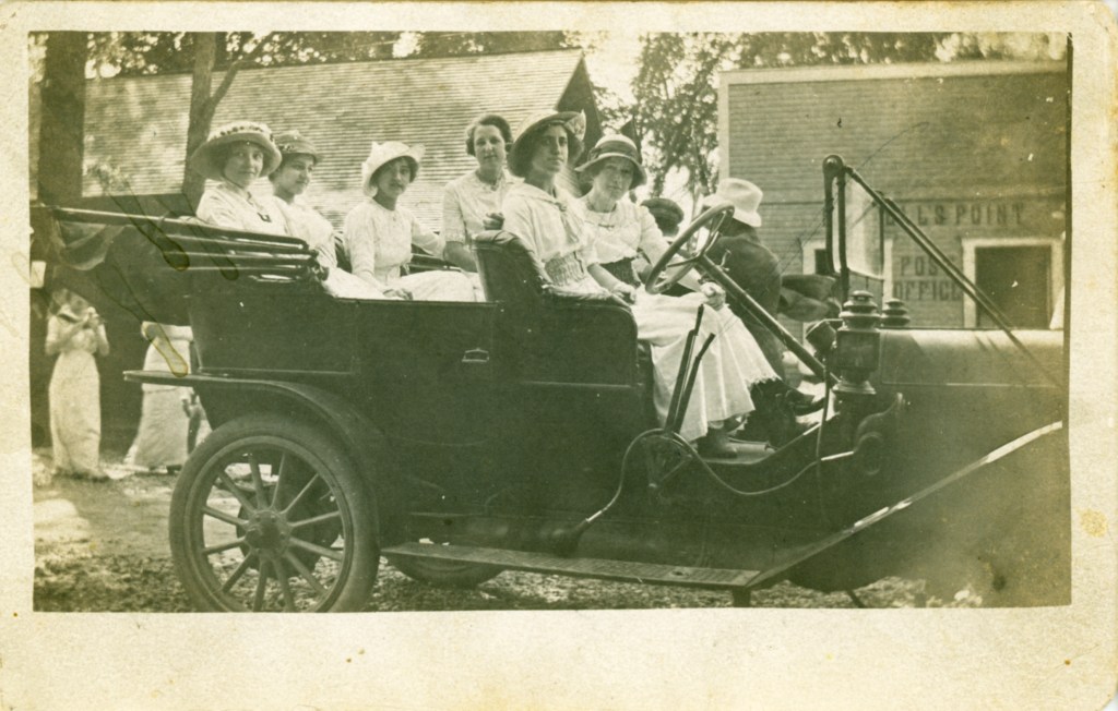 Undated photograph showing a group of women posing in their automobile in front of the post office.