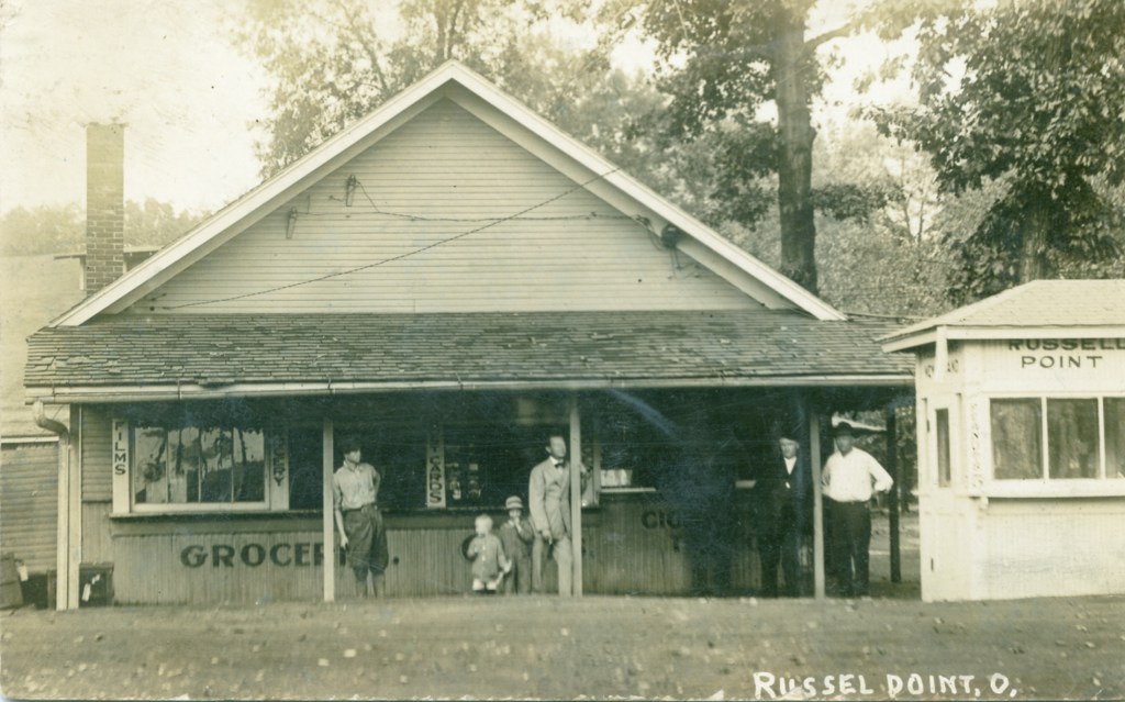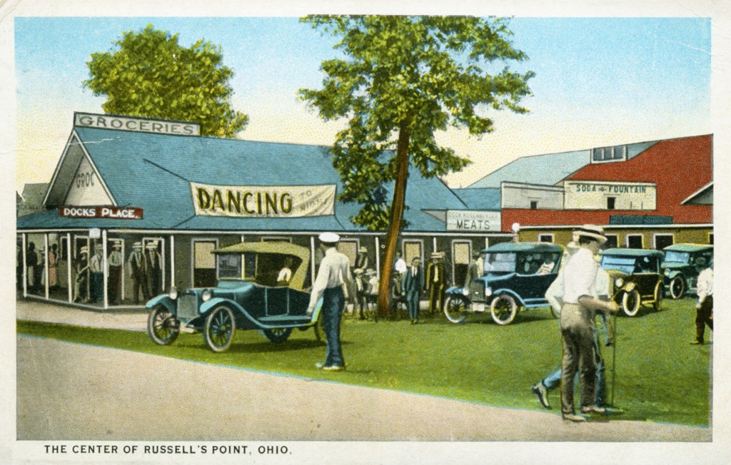 This 1926 postcard is titled “The Center of Russell’s Point” and shows from left to right the grocery store, the post office and soda-and-fountain stand called “Dock’s Place” on earlier postcards; to the extreme right the roof of the Dreamland Dance Pavilion is visible. The road in the foreground is Main Street.