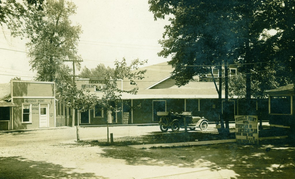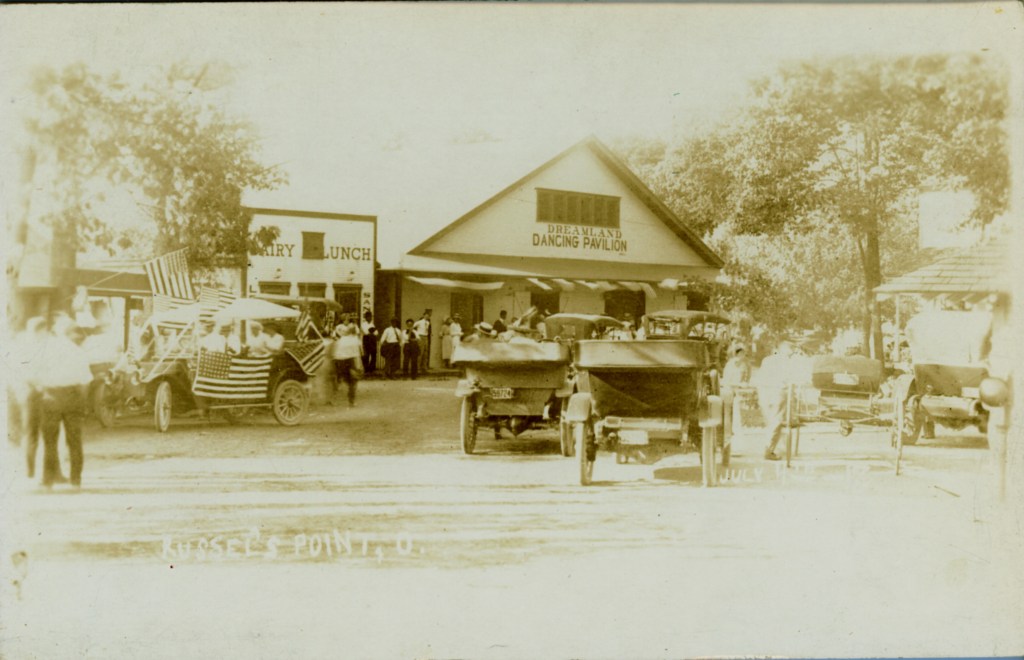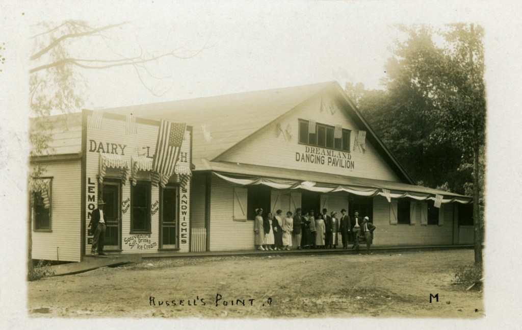In 1911, Mr. A. B. Jones purchased Morris Bundy’s Resort on the west side of the harbor in Russells Point and enlarged the hotel, constructed a grocery store and a Post Office that was open during the summer only. Mr. Jones also built the first dance hall, the Dreamland Dancing Pavilion.