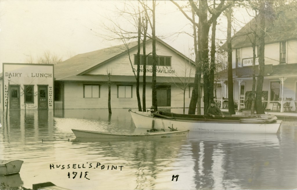 The Great Flood of 1913 occurred between March 23 and March 26, after major rivers in the central and eastern United States flooded from runoff and several days of heavy rain. Around Indian Lake, flooding occurred in Lakeview but also in Russells Point, as evidenced by this postcard. Since then, flooding has continued to plague the lake region, even after the recent rebuilding and heightening of the Waste Weir.