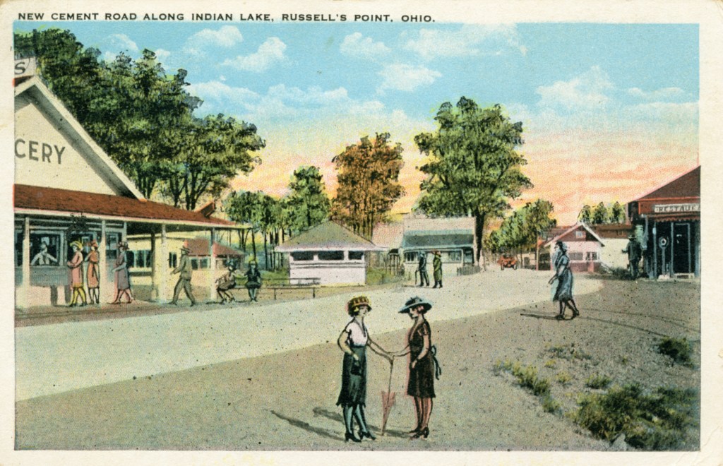 The first concrete or cement road in the Indian Lake area was U.S. Route 33 – now State Route 366. The first stretch was built in 1921 from the Auglaize County line to Lakeview. A second section ran from the waste weir to Lakeview. In the early 1920s a new cement road was big news for the community and celebrated with postcards such as the one shown here. In June, 1926, the Lima News raved about the “excellent concrete road extending from Lakeview to Russells Point and for hundreds of miles in both directions from those towns. A series of lights are being installed high above the heads of the occupants of speeding automobiles.” The age of the automobile had arrived!