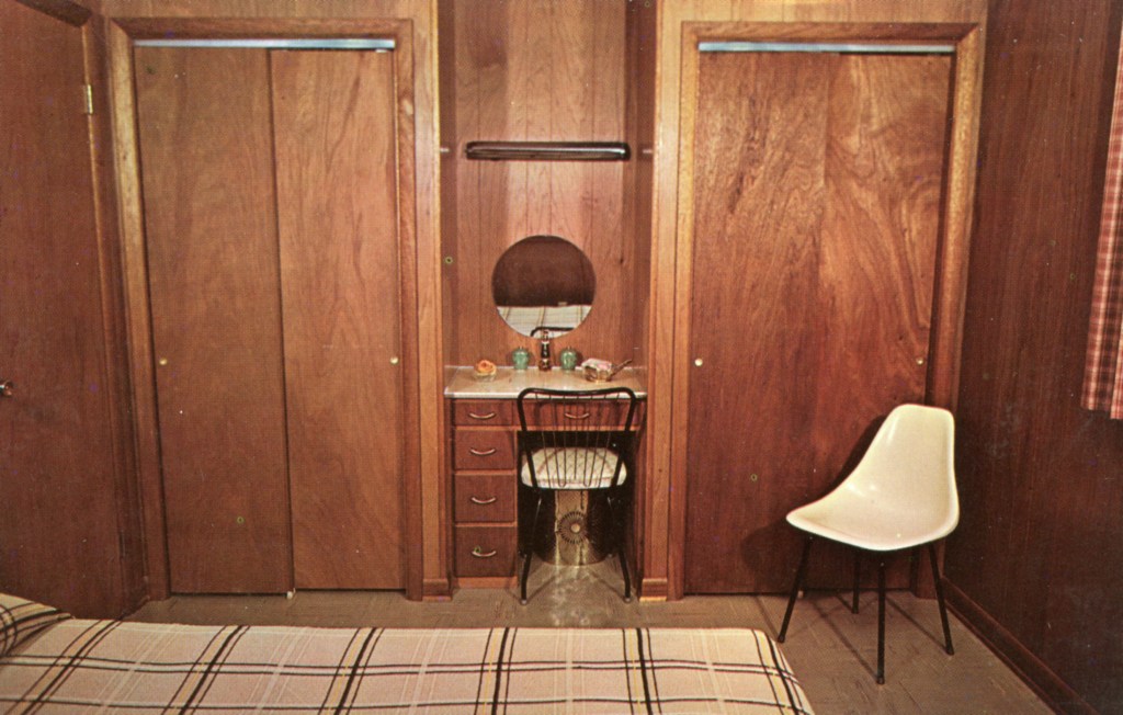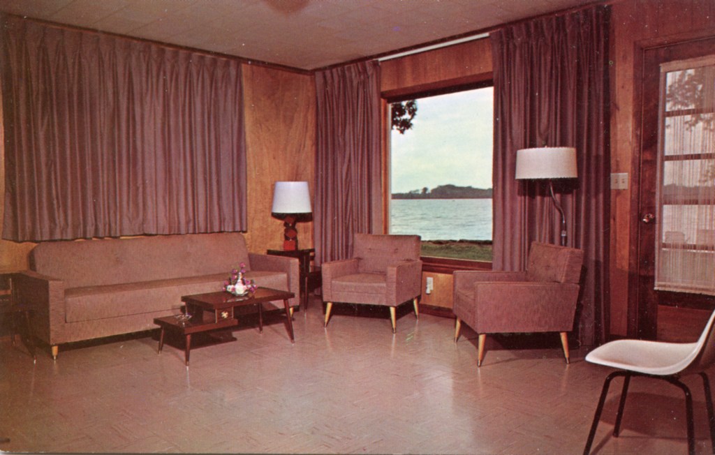 Interior views of the cottages at the Wicker Resort. The postcard on the right shows a partial view of the beautiful and spacious living room in the ultra- modern waterfront cottages, and the postcard on the left shows a partial view of the compact yet spacious, bedroom. The wall-to-wall wood paneling, the unpainted wooden doors, and the linoleum floors were the typical cottage-look in the 1950s and 1960s. The tan-colored furniture, with matching curtains, and modern table and lamps, complemented this mid-century look.