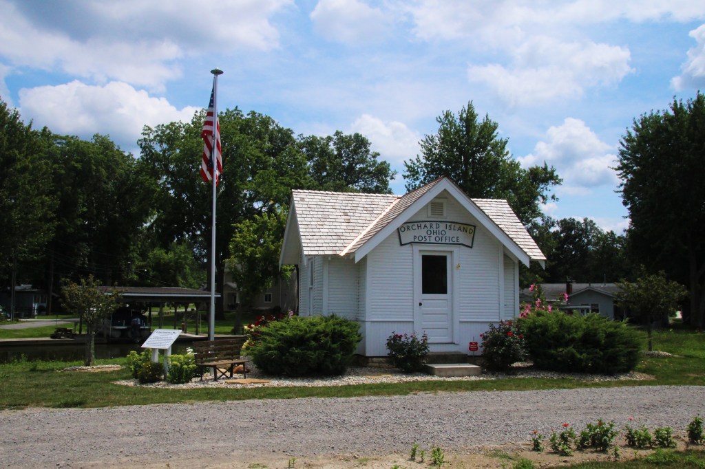 The Indian Lake Historical Society gives the following information: “The Orchard Island Post Office was in operation to serve the south side of Indian Lake from July 29, 1912, to November 15, 1926. It was originally located on the water’s edge at the Wicker Resort. The only Postmistress at the Orchard Island Post office was Ruby Tarr. Mrs. Tarr’s husband, Alexander, was the owner of the Orchard Island Resort until he sold it in 1927 to Orchard Islands Inc. After the Orchard Island Post Office closed, the side windows were cut out and it was used as a pop stand and later as a bait store at the Wicker Resort. In 2004, the building was donated to the newly established Indian Lake Area Historical Society by Isabelle Wicker Pusey. The building was then moved from the former Wicker property to its present location on the recently named Post Office Island site between Wolf and Orchard Islands. In 2016, teams of residents and volunteers from the Indian Lake Area Historical Society came together to restore the former Orchard Island Post Office that had fallen into disrepair. With donations from the Indian Lake Development Corporation and the ODNR, everyone came together to restore the building.”